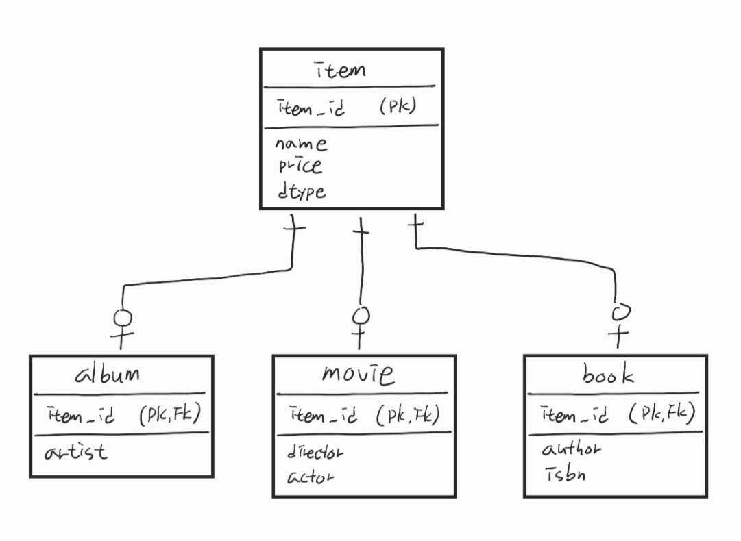 위 그림의 음반, 영화, 책 모델을 각각의 자식 테이블로 만들고 key를 기본키+부모의 외래 키로 사용하는 전략입니다.