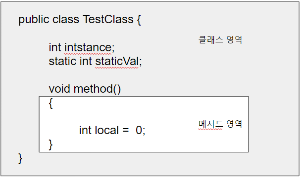 - 위에서 지역 변수인 local은 메서드 영역에서 선언되었다.