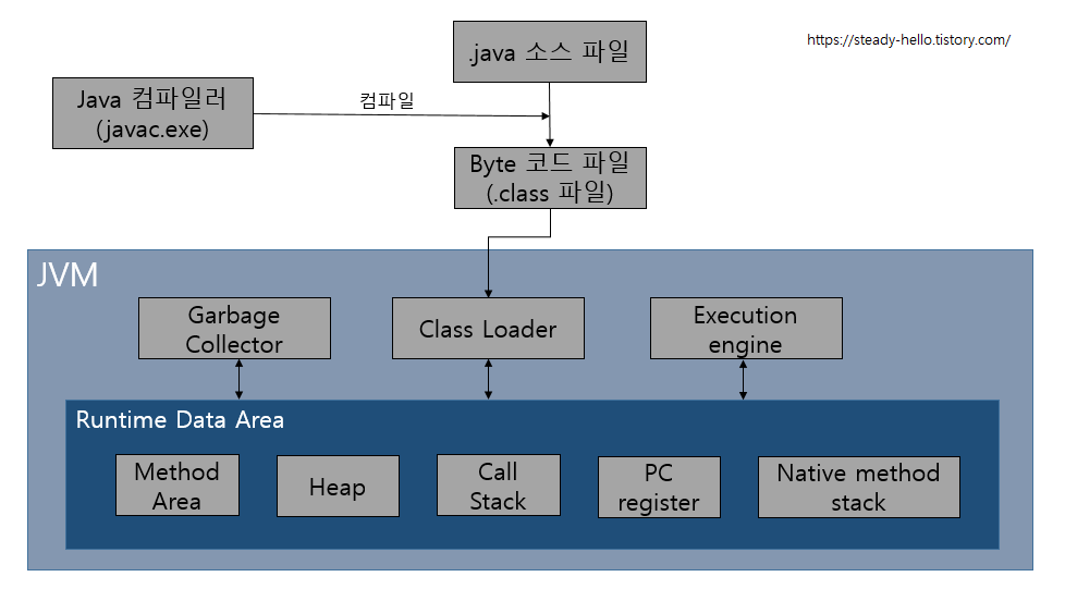 자바 프로그램을 실행하면 컴파일 과정을 거쳐 byte코드를 생성하고 JVM에서 이를 해석하는 과정(interpreter)을 거친 후 실행됩니다.