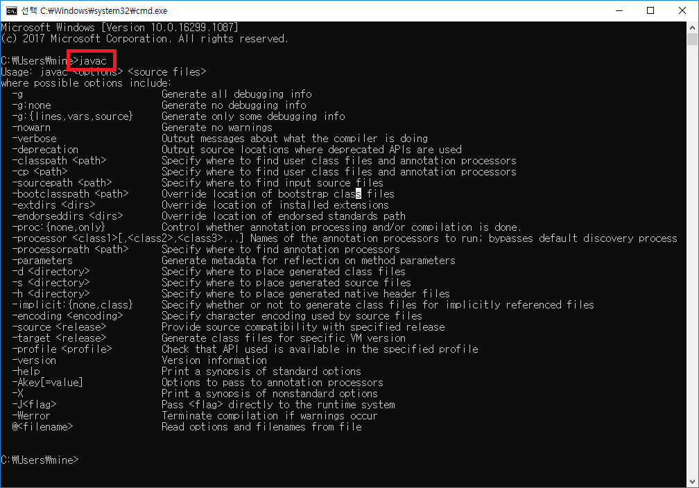 명령창에서 아래와 같이 'java' 또는 'javac' 명령어를 입력하여 아래 사진과 같은 내용이 출력되는 것을 확인한다.
