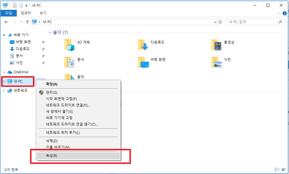 먼저 '내 PC'를 우클릭하여 속성을 클릭한다.