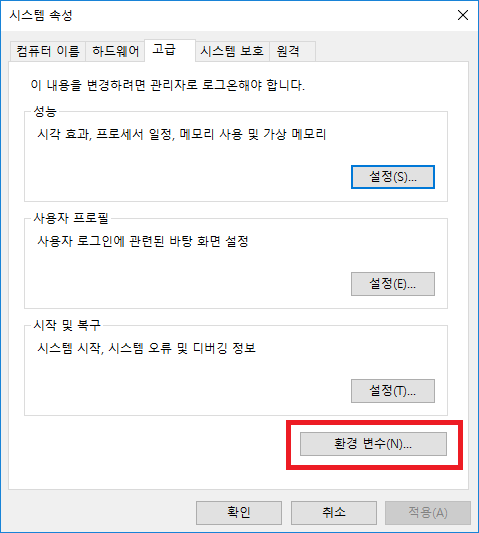다시 아래 표시된 '환경 변수' 버튼을 클릭한다.
