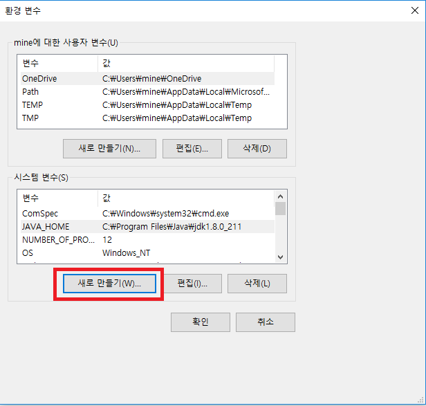 이제 '새로 만들기'를 클릭하여 JAVA_HOME 변수를 생성해 보도록 하자.