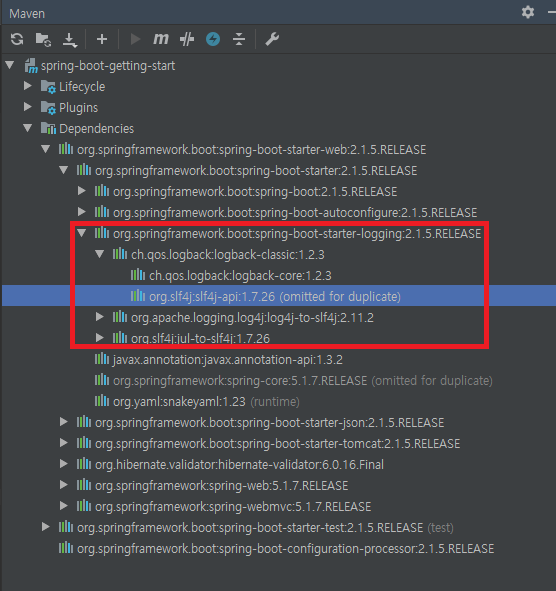 jul-to-slf4j, log4j-to-slf4j와 같이 결국 slf4j를 호출하게 되고 slf4j-api를 통해 logback을 이용하는 것을 확인할 수 있다.